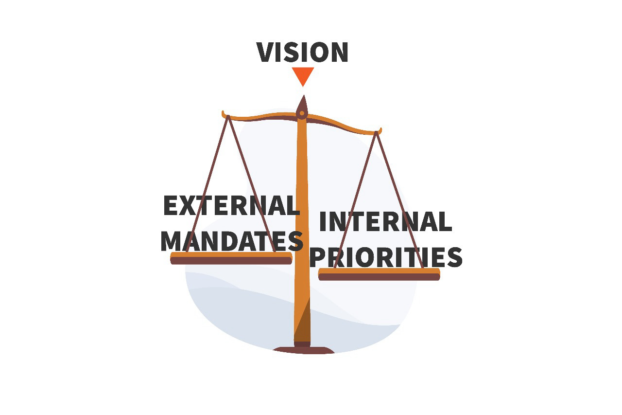 Only when people’s voices have been heard and some action steps identified in response, does it make sense to turn everyone’s attention to external mandates about which we often have no say at all! In my experience, it’s very common to do the opposite–to begin with external mandates, perhaps visit vision, and MAYBE make it to some awareness of internal priorities. The engagement created by deeply listening and responding to internally identified priorities, on the other hand, spills over into discussion of turning external directives into specific goals. Not only that, but engaged team members are also more empowered, which leads into a generative space of helping to formulate reasonable, well-formed goals that meet external mandates. I’ve experienced this time and again, even in the classroom. When students see that I’m willing to set up extra study sessions or clarify rubrics or move due dates, they work with me to set academic goals that help them achieve high exam scores, for example. In essence, we’re creating a culture that strongly communicates that we are all walking in the same direction, and that everyone’s input and leadership is required.